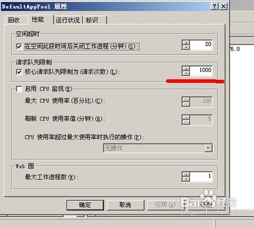 2.如果沒有關閉應用程序池,那就要看看是否請求到達時應用程序池隊列已滿。每個網站都有其最大的負載量,當訪問請求達到這個值的時候就會出現503錯誤,解決辦法可以加大請求隊列,默認值為1000。