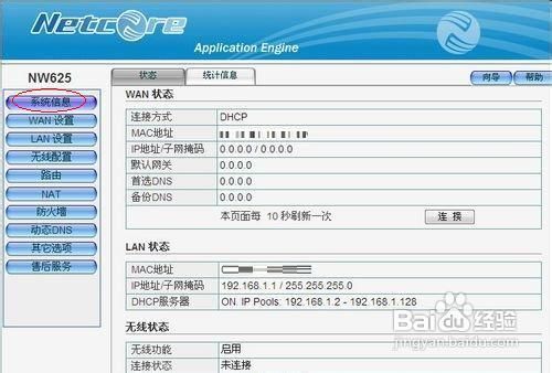 6.成功登陸后首先進入系統(tǒng)信息頁面,打開界面后,看到的是系統(tǒng)信息下的狀態(tài)頁面。我們可以在這里找到WAN、LAN、無線以及路由狀態(tài):