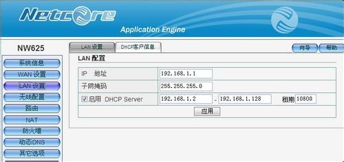 7.進去后一般我們是先檢查并開啟DHCP服務。點擊左側的“LAN設置”按鈕,在“LAN設置”選項卡下,確保勾選了“啟用DHCP Server”復選框,后面的IP范圍可用默認的。完成后點擊“應用”按鈕保存設置: