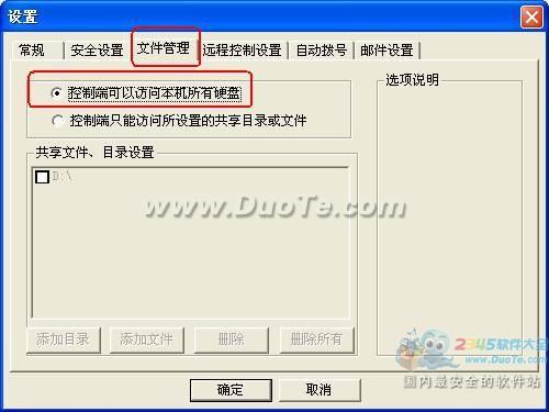 二、只共享指定文件或文件夾。選擇“控制端只能訪問所設置的共享目錄或文件”—“添加文件”—“添加文件”。