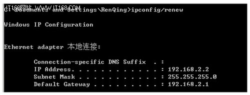 c)跟著輸入獲取IP地址的命令ipconfig/renew,片刻后顯示出新的IP地址: