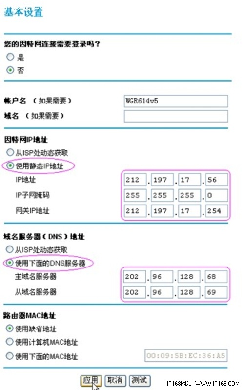 4.2.1. 第一個(gè)選擇項(xiàng)”您的因特網(wǎng)連接需要登錄嗎?”選擇“否”,”因特網(wǎng)IP地址”選擇“使用靜態(tài)IP地址”,”域名服務(wù)器(DNS)地址”選擇“使用下面的DNS服務(wù)器”,將IP地址、子網(wǎng)等信息鍵入,然后點(diǎn)擊“應(yīng)用”如下圖: