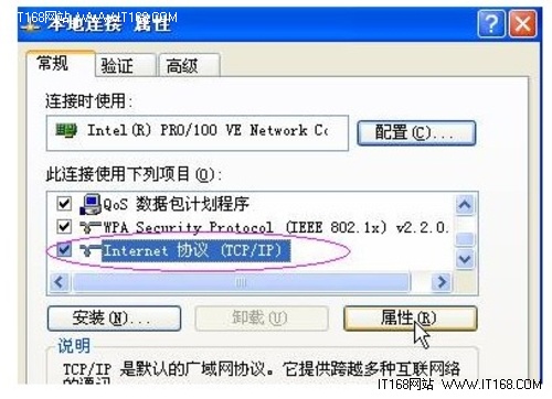 2.1. 啟動電腦,右鍵單擊桌面或“開始”中的“網(wǎng)上鄰居”選“屬性”,右鍵單擊“本地連接”選“屬性”,選中“Internet協(xié)議(TCP/IP)”,點(diǎn)擊“屬性”:
