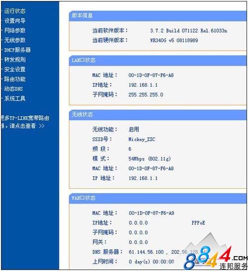 首先這里是第一個選項運行狀態。剛才我們對TP-LINK無線路由的設置都反映在上面,如果你是ADSL撥號上網用戶你在這里的頁面按連接就可以直接連上網絡,如果你是以太網寬帶用戶則通過動態IP或固定IP連接上網,這里也會出現相應的信息。