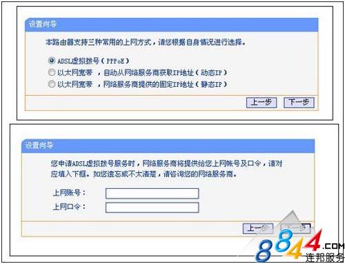 2.如果通過ASDL撥號上網用戶選擇“PPPoE”來進行下一步設置。局域網內或其它特殊網絡連接(如視訊寬帶、通過其它電腦上網之類)可以選擇以下兩項“以太網寬帶”來進行下一步設置。ADSL撥號上網設置下兩項在后面都將會進行說明。ADSL撥號上網的帳號和口令輸入界面,按向導界面的提示輸入必須的信息,例如用戶在網絡服務提供商所提供的“上網帳號”和“密碼”然后按下一步。
