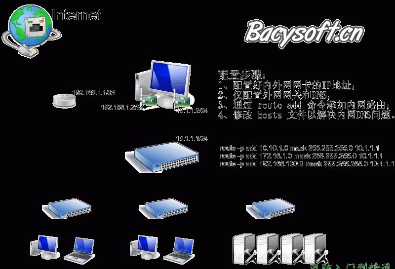然后,測試一下網絡,使用Ping分別測試外網網關、內網網關以及內網其他業務網段。C:>ping 192.168.1.1Pinging 192.168.1.1 with 32 bytes of data:Reply from 192.168.1.1: bytes=32 time=1ms TTL=64Reply from 192.168.1.1: bytes=32 time<1ms TTL=64Reply from 192.168.1.1: bytes=32 time<1ms TTL=64Reply from 192.168.1.1: bytes=32 time<1ms TTL=64Ping statistics for 192.168.1.1: Packets: Sent = 4, Received = 4, Lost = 0 (0% loss),Approximate round trip times in milli-seconds:Minimum = 0ms, Maximum = 1ms, Average = 0msC:>ping 10.1.1.1Pinging 10.1.1.1 with 32 bytes of data:Reply from 10.1.1.1: bytes=32 time=1ms TTL=64Reply from 10.1.1.1: bytes=32 time<1ms TTL=64Reply from 10.1.1.1: bytes=32 time<1ms TTL=64Reply from 10.1.1.1: bytes=32 time<1ms TTL=64Ping statistics for 10.1.1.1: Packets: Sent = 4, Received = 4, Lost = 0 (0% loss),Approximate round trip times in milli-seconds:Minimum = 0ms, Maximum = 1ms, Average = 0ms 到此,這臺具有雙網卡的機器已經具備了內外網同時訪問的能力。當然這還不完美,有一個小問題。即:如果內網存在需要使用域名訪問的服務則會無法訪問,因為我們設置的DNS是公網的服務器。解決的辦法也很簡單,修改本地Hosts文件即可,關于Hosts文件的修改方法,敬請參考本站資料HOSTS文件設置攻略。