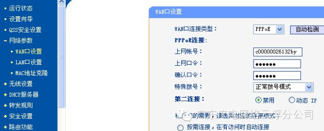 在左邊菜單欄選擇“網(wǎng)絡(luò)參數(shù)-WAM口設(shè)置”,右邊WAM口連接類型選擇“PPPOE”,上網(wǎng)賬戶輸入用戶寬帶賬戶,上網(wǎng)口令和確認(rèn)口令輸入用戶賬戶的密碼。然后保存。