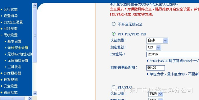 無線安全設(shè)置中,設(shè)置如上圖。注意:PSK密碼為您家的無線(wifi)密碼,密碼可自定義。