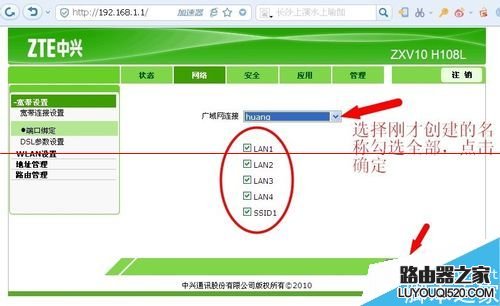 5、網絡--寬帶設置--端口綁定--廣域網連接 選擇你剛才創建的 新連接名稱。全部勾選lan1 lan2 lan3 lan4 ssid1。點擊確定。
