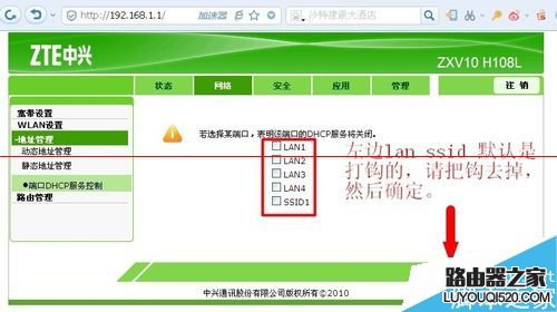 10、網絡--地址管理--端口DHCP服務控制,提示說打鉤是關閉的,我們必須開啟他,把鉤全部去掉,點確定。 ok可以把網線拔掉,用wifi上網啦!