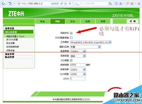 6、oK,看到這里我們可以設置WIFI了,網絡--WLAN設置--基本設置(11n),勾選無線開關,其他默認,然后點確定。