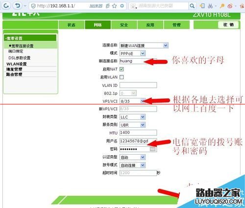 4、網絡--寬帶設置--寬口連接設置,新建一個連接,如果不能新建,可把其他的連接刪除重新新建一個如下圖。模式--選pppoe;新連接名稱--用你喜歡的字母;注意要點--VPI/VCI一般選8/35,可以根據各地選填;賬戶和密碼是你電信寬帶的撥號用戶名和密碼;其他默認,然后點擊創建。