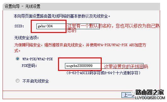 5、這里進(jìn)入到設(shè)置無(wú)線名稱和密碼,SSID即路由器的無(wú)線網(wǎng)絡(luò)名稱,可以自行設(shè)定,建議使用字母和數(shù)字組合的SSID。選擇無(wú)線安全選項(xiàng),密碼用于連接無(wú)線網(wǎng)絡(luò)時(shí)輸入驗(yàn)證,能保護(hù)您路由器的無(wú)線安全,防止別人蹭網(wǎng)(密碼也建議以數(shù)字加字母組合,安全性高)。
