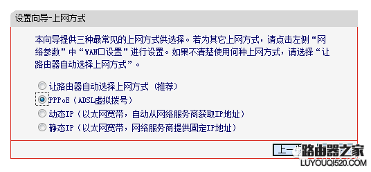 3、這里要選擇上網(wǎng)方式,選項(xiàng)有好幾種,長(zhǎng)城寬帶的網(wǎng)絡(luò)請(qǐng)選用第二種PPPOE(ADSL虛擬撥號(hào))選好后,點(diǎn)擊下一步;