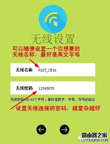 接下來(lái)就是設(shè)置無(wú)線網(wǎng)絡(luò)了也就是wifi,可以設(shè)置一個(gè)名字,無(wú)線密碼最好復(fù)雜一點(diǎn)要含有字母和數(shù)字,以免被別人破解蹭網(wǎng)