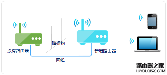 如果使用環境中,障礙物較多,可通過網線連接無線路由器,實現擴展網絡的需求。使用網線把兩個路由器的LAN口相連,此時增加的無線路由器相當于無線AP(無線交換機)。