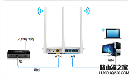 如下圖所示:貓出來(lái)的網(wǎng)線,連接到路由器的WAN口,再使用網(wǎng)線將電腦連接到路由器任意一個(gè)LAN口。如果沒(méi)有足夠的網(wǎng)線,可以通過(guò)無(wú)線方式連接到路由器。