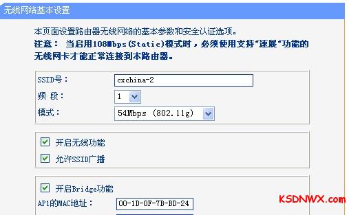 在左側無線參數“基本設置”這一欄,我們可以看到圖上所示列表。進行無線橋接,SSID號最好相同,因為這樣可以實現無線漫游。頻段也必需相同,一般情況下都會默認6,但是家中有微波爐的話,建議更改成1或者11。