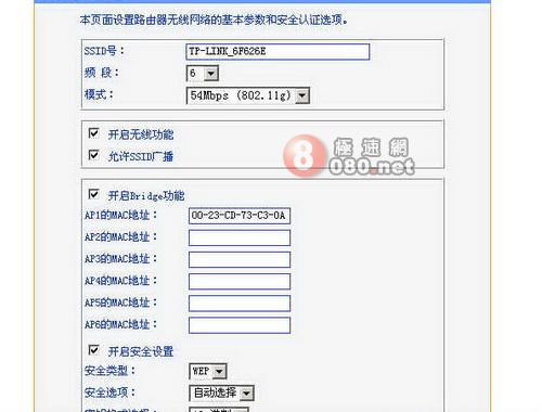 3、設置無線參數。開啟Bridge功能,其中的MAC地址是另一臺 641G無線路由的MAC地址。同相的,另一臺641G的同樣位置也添上指示340G的MAC地址。
