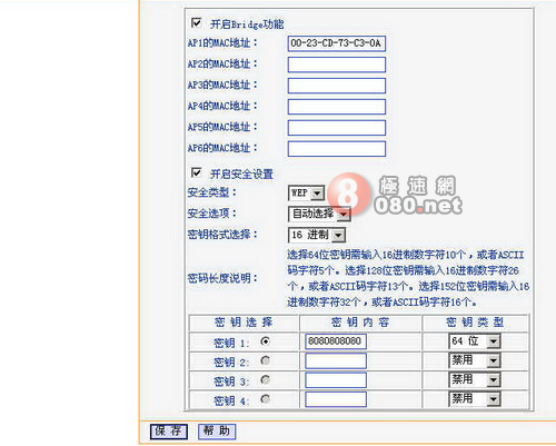其它設備與A相同,唯一不同的就是B路由的AP1的MAC地址欄要輸入A路由器的MAC地址。在進行保存設定工作后,兩個路由設備的橋接工作算是基本完成了。