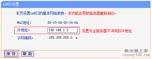在 網絡參數 >> LAN口設置,修改IP地址和主路由器不相同(建議設置IP地址與主路由同一網段)。設置完成點擊 保存