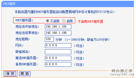 在路由器管理界面 DHCP服務器 >> DHCP服務中,將DHCP服務器選擇為 不啟用,點擊 保存