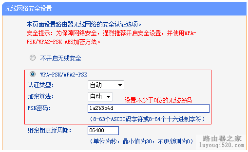 進入 無線設置 >> 無線安全設置。選擇 WPA-PSK/WPA2-PSK,填寫不少于8位的 PSK密碼(無線密碼)。設置完成后點擊最下方 保存 按鈕。此時用重啟路由器,直接進入下一步設置。