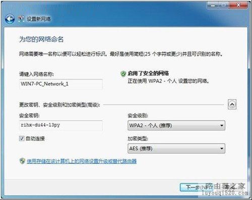 6、操作完后,然后系統會自動賦予一個網絡名稱,同時,Win7也會默認選擇一個可用的、安全級別最高的加密方式來保護用戶的信息安全。此時如果你不想進行任何高級的設置,可以直接點擊下一步。