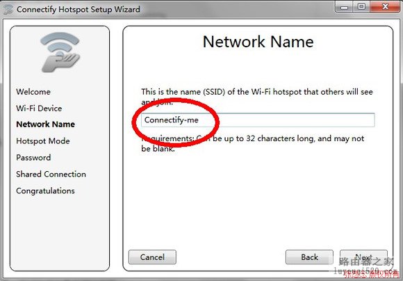 2、 設置網絡連接的名稱,就是WLAN接入點名稱(SSID),可以隨便填寫(但不能為中文),這里我們填寫的是“Connectify-me”。