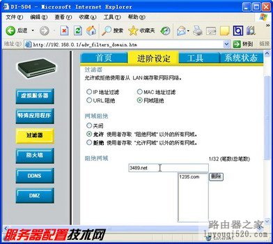 讓孩子健康上網是每個家長最關心的問題,家長可以通過設置DI-504路由器提供的過濾器功能過濾掉一些不良網站,使孩子免遭不良信息的侵蝕。過濾不良網站的步驟如下所述: