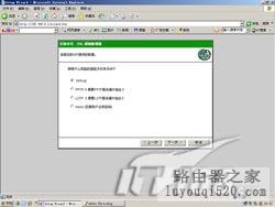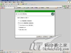 這時會有一個Internet接入的選項界面,在這個界面里我們可以根據自己使用的寬帶線路進行具體的選擇,目前,使用比較多的寬帶接入線路有ADSL、CABLE MODEM和小區寬帶三種,如果是CABLE MODEM線路,我們可以選擇第一項,而ADSL和小區寬帶線路我們可以選擇第二項。這里我們假設用戶使用的是ADSL線路,選擇第二項,單擊下一步繼續配置。