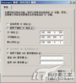 在彈出的對話框中選擇“使用下面的IP地址”選項,這時我們便可以設置這臺PC的IP地址了。寬帶路由器的出廠IP地址一般都為192.168.0.1,所以我們在配置的時候需要將配置的PC設置和寬帶路由器在同一個網段當中。這里,我們將這臺PC的IP地址設置為192.168.0.254,子網掩碼255.255.255.0,默認網關為192.168.0.1。
