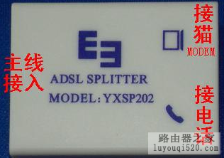 主線,也是就入室線,要接到LINE IN接口,然后分別從PHONE接到電話,MODEM接到貓(MODEM)也就是調制解調器,有的分離器帶圖形標志,如下圖