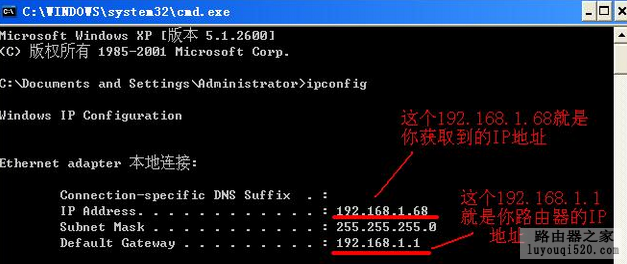在這里輸入ipconfig 回車,就可以查看你獲取到的IP地址了