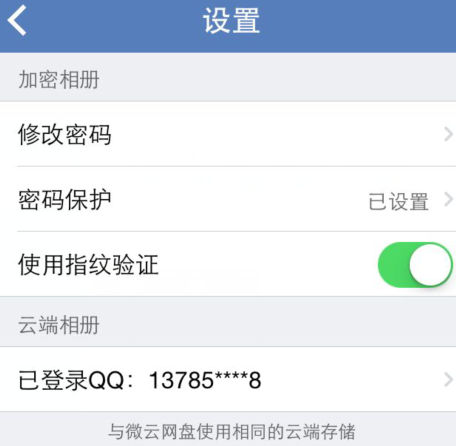 4、在這里小編插播一下,請注意上圖中右上角的 設(shè)置 ,點(diǎn)擊之后顯示下圖,這里點(diǎn) 修改密碼 就可以修改照片加密的密碼,還可以設(shè)置指紋鎖。