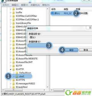 2. 定位到HKEY_ROOTIE.HTTPshell ,雙擊打開右側(cè)【(默認(rèn))】將默認(rèn)值設(shè)置為空→點(diǎn)擊【確定】