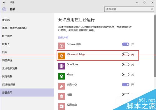 3、打開“背景應用”設置。在右邊欄找到“Microsoft Edge”,將開關設置為“關”。如圖所示。