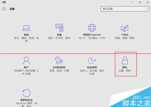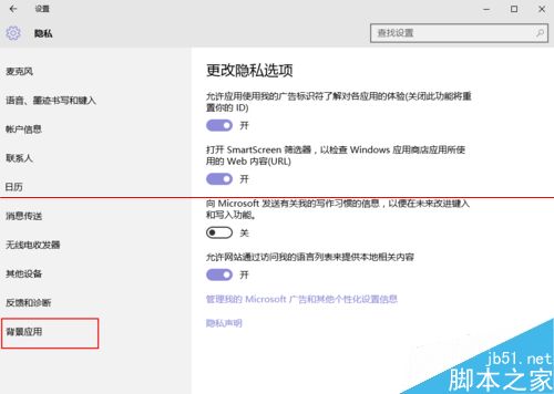 2、在打開的“隱私”設置選項欄中,拖動滾動條,找到最后的“背景應用”,如圖所示。