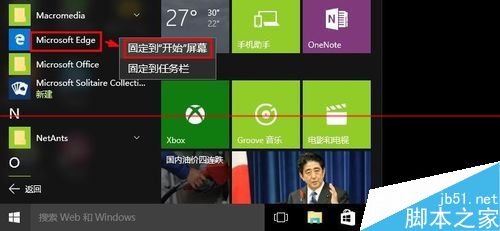 4、當然我們也可以在Microsoft Edge瀏覽器上單擊鼠標右鍵,固定到開始屏幕。