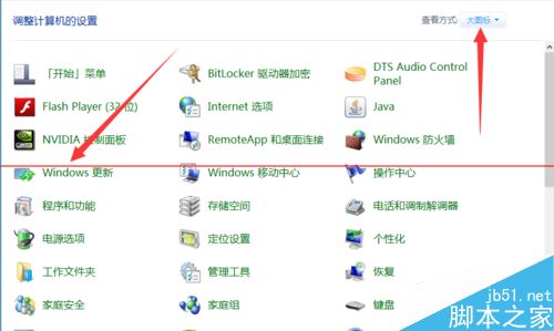 2、進(jìn)入控制面板界面,將右上角查看方式更改為【大圖標(biāo)】,然后在下方列表中找到【windows 更新】選項(xiàng),點(diǎn)擊打開