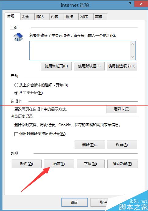 2、在彈出的internet選項(xiàng)對(duì)話框中,進(jìn)入【常規(guī)】界面,點(diǎn)擊下方【語(yǔ)言】選項(xiàng)