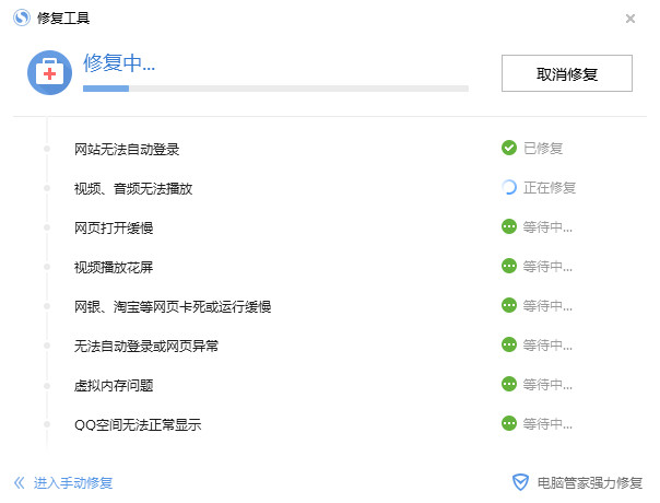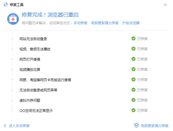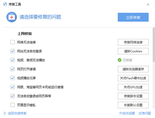 快速修復可修復網站無法登陸、音視頻無法播放、網頁打開緩慢、虛擬內存等問題,如果可以在快速修復界面找到你遇到的問題,則點擊快速修復,