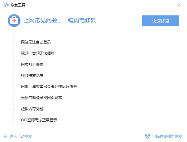 彈出瀏覽器修復窗口,如下圖界面默認為快速修復,可修復界面例出的問題,點擊左下角為手動修復,可以修復其他的問題,右下角有電腦管家強力修復,點擊則提示安裝電腦管家,可安裝進行修復,按照自己的需要決定。