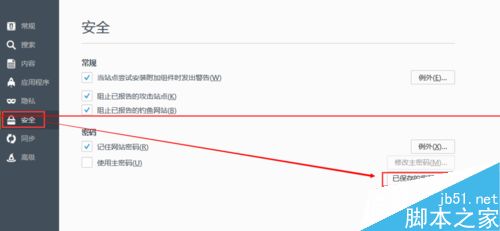 2、在出現(xiàn)的選項(xiàng)對(duì)話框--找到”安全"---“已保存密碼”點(diǎn)擊進(jìn)入