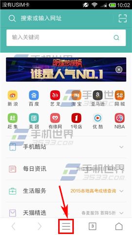 1)打開【UC瀏覽器】,進入到首頁后點擊下方的導航欄的三道杠【三】。(如下圖)