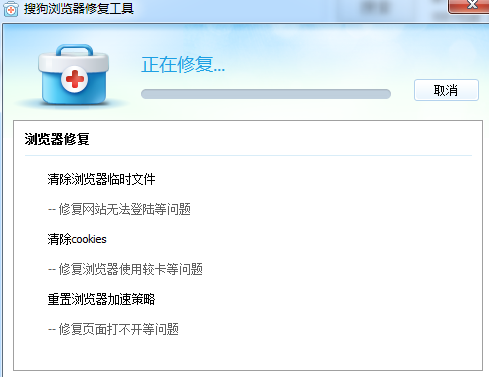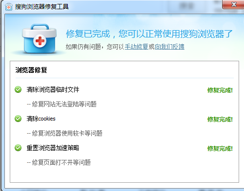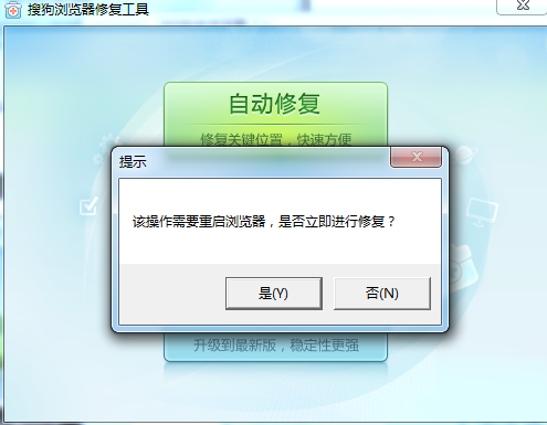 4、自動修復完成后,提示修復完成,關閉提示框,重新啟動瀏覽器即可