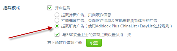 3、如果想更徹底地攔截網(wǎng)站廣告,建議選中攔截所有廣告