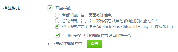 2、選中開啟攔截,開啟360瀏覽器廣告攔截