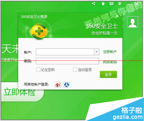 2、這時候在這出現的小面板中點擊登陸,輸入我們的自己的360賬號。(如果沒有賬號的話,點擊它旁邊的注冊賬戶,然后輸入自己的郵箱注冊一個。)