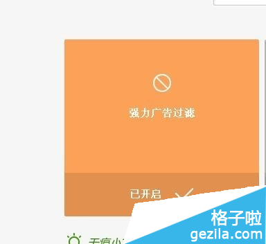 單擊灰色的“強力廣告過濾”功能窗口。即可開啟360瀏覽器過濾廣告功能。
